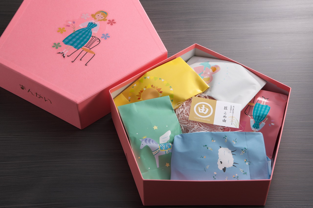 お祝いの品にふさわしい「まんかい」。5種類のお米は選別とふるいを共に3回行い、〝落ちなかった〟ものだけを使用した縁起の良いセットです。